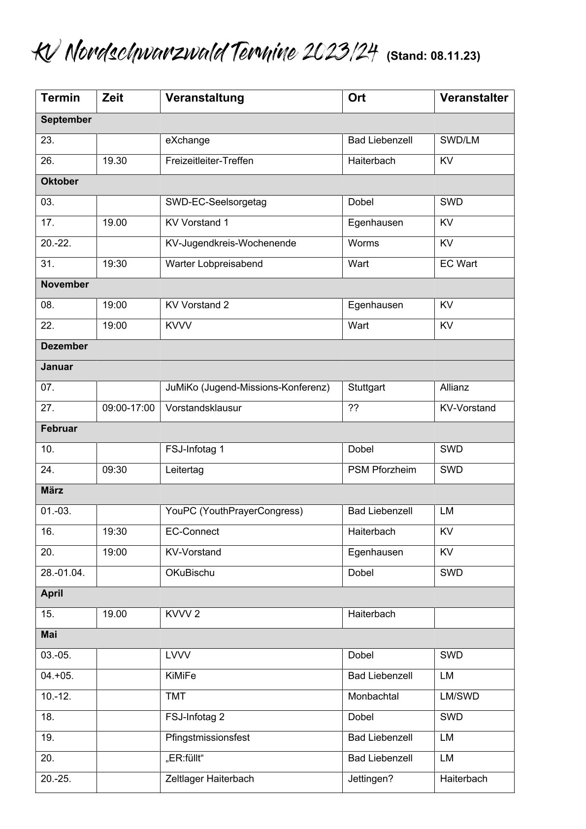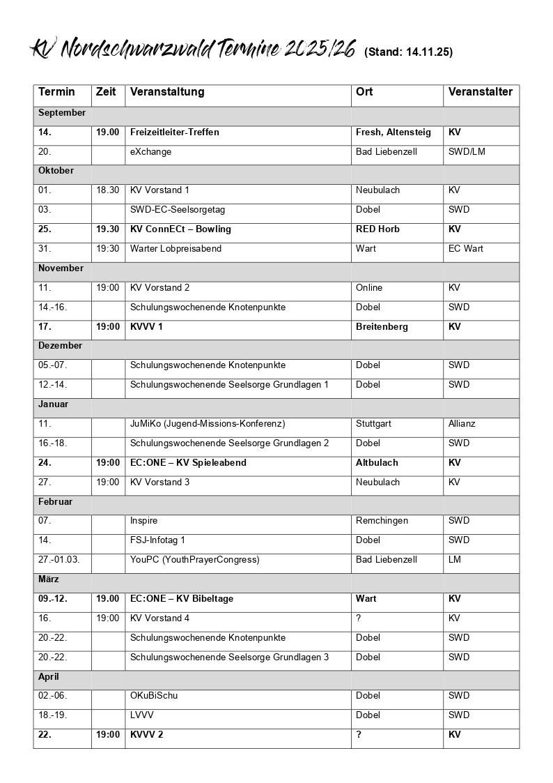 Hier findest Du alle aktuellen Veranstaltungen des EC KV Nordschwarzwald! Weitere Veranstaltungen findest du über die Jugendarbeiten vor Ort.